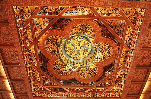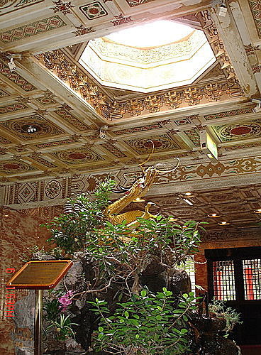 大廳中央天花板有藻井~梅花形狀,梅花中有五條金龍環繞一顆龍珠,稱為「五福臨門」!